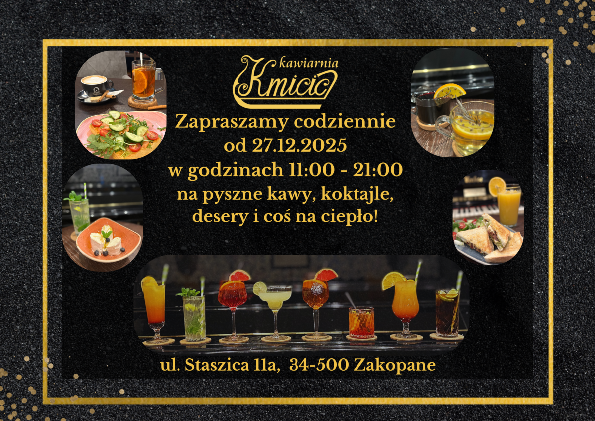 Na parterze „Willi Kmicic” znajduje się elegancka kawiarnia o powierzchni 132 m2. Jest ona czynna w godzinach od 11.00 do 21.00. Można tu napić się aromatycznej kawy, rozgrzać przy kubku góralskiej herbaty, lub zrelaksować przy orzeźwiającym drinku. Serwujemy też słodkie ciastka oraz kanapki na ciepło.